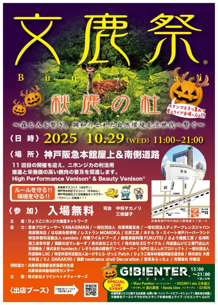 ※入場条件:「文鹿祭®」(神戸阪急本館南側道路)での飲食、買物、ワークショップ参加などでスタンプカードにスタンプを3つ集めて、ジビエンタ会場入口でご呈示いただいた方のみ入場できます。スタンプカードは「文鹿祭®」会場でお渡しします。
